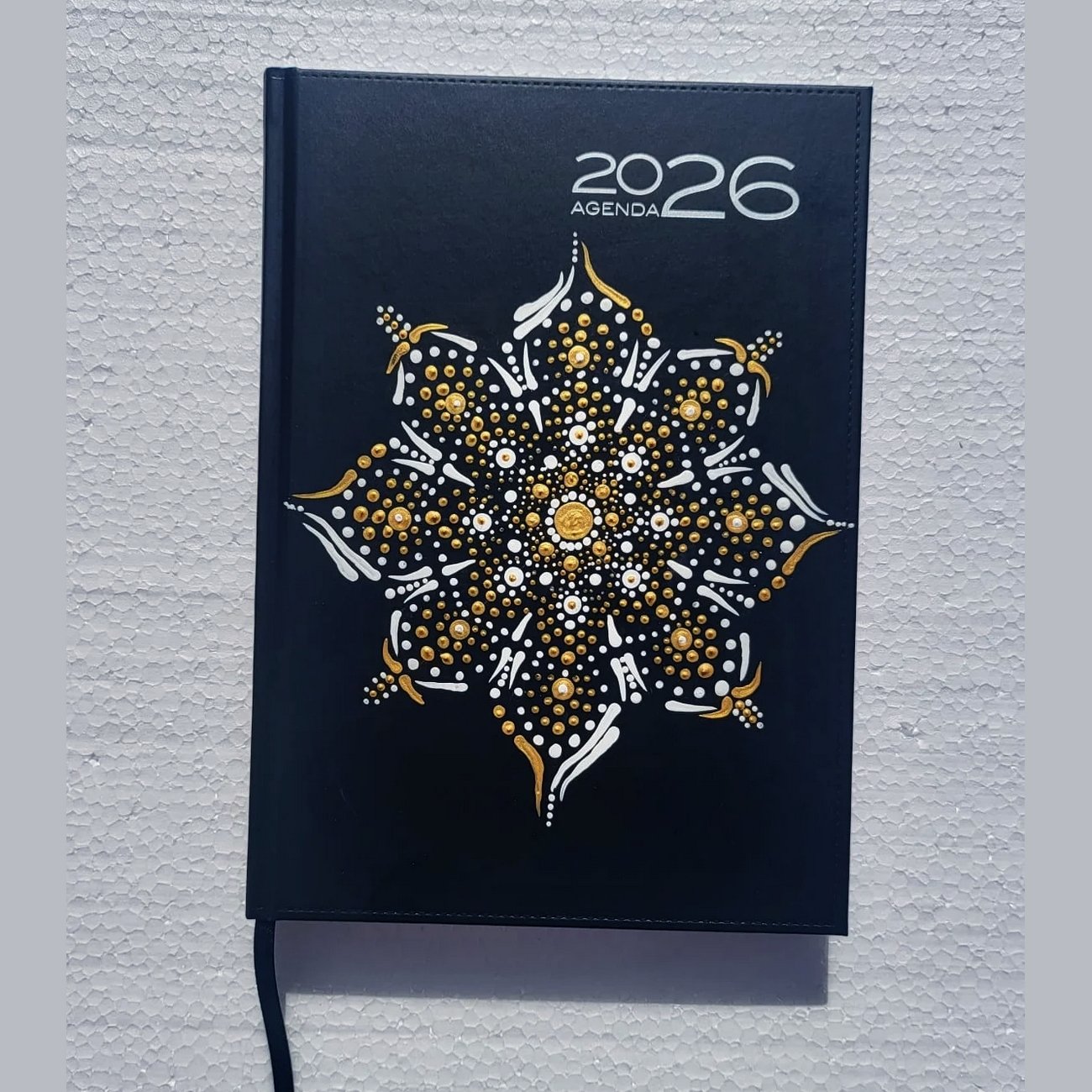 A mandala foi pintada à mão com tinta acrílica.