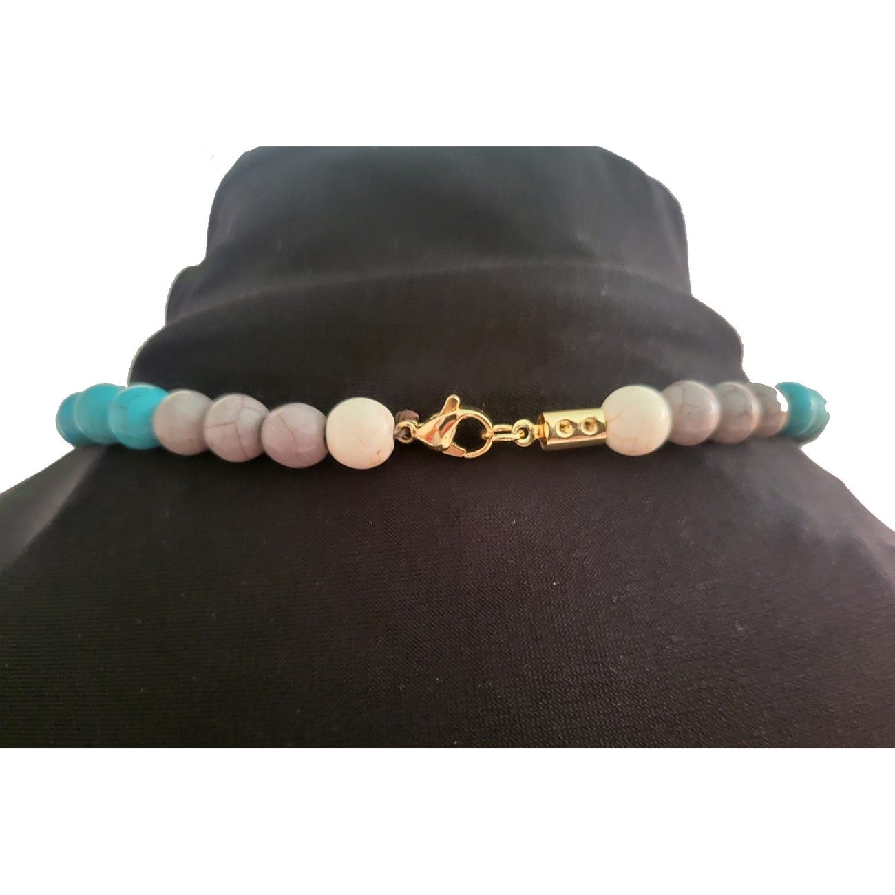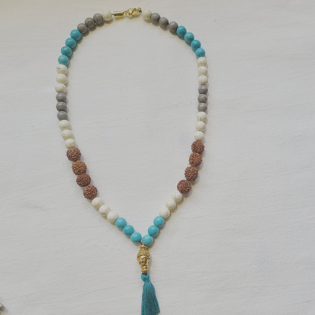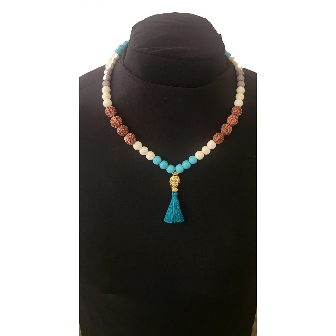 Materiais: toda a peça é construída com elementos nobres, cristais de howlita, sementes indianas, fios de algodão e de seda, o fecho e o meru (busto de Buda) são de metal dourado