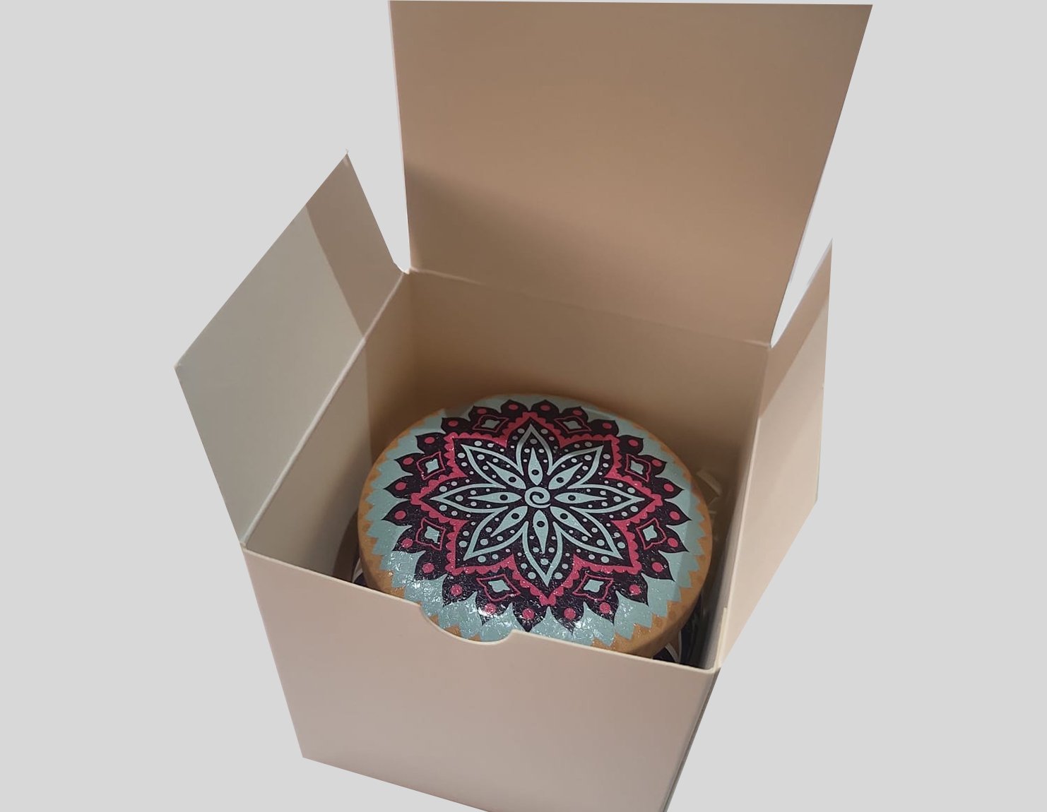 A embalagem é uma linda lata decorada que pode ser reaproveitada.